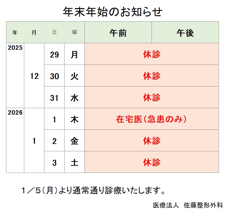 ようこそ、医療法人佐藤整形外科へ。 佐藤整形外科は初代佐藤光雄が昭和35年に大財5丁目に開業して以来、今年で64年目にあたります。 昭和41年に現在の大財3丁目に場所を変え、平成11年からは現院長 佐藤直人が継承し診療にあたっています。これからも何でも相談できる整形外科、有床診療所として地域医療に貢献していく所存ですので、よろしくお願いします。 医療法人 佐藤整形外科 診療・リハビリのお知らせ 更新日 2024.8.1 玄関開錠時間のお知らせ 玄関開錠時間のお知らせ待合室での密集・密接を回避するため、8時15分としております。ご迷惑をおかけしますが、ご了承ください。